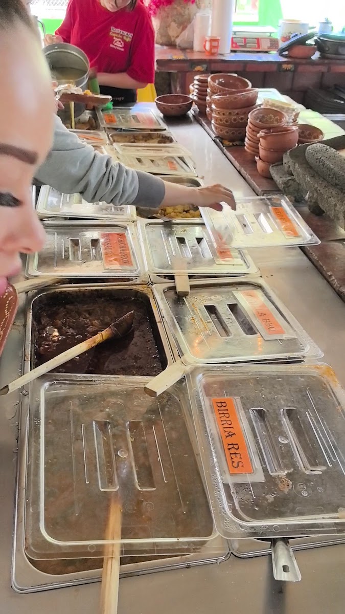La comida está muy rica, el bufette incluye birria, arroz, frijoles, rib eye, picaña, chorizo, arrachera, lengua en salsa verde (deliciosa), camarones a la diabla, carne con chile, queso fundido, dedos de queso,nuggets entre otros. Agua fresca y café americano o de olla ilimitados. El café de olla esta muy bueno y para acompañar, pan dulce. También venden productos de la granja como huevo, quesos, cajeta, etc. Está muy bonito el lugar recomendable para ir con niños ya que tienen acceso a ver una gran variedad de animales de granja. Una excelente opción para relajarte y pasarla agusto fuera de rutina. Todo es pura naturaleza. Tiene amplio estacionamiento, la música es agradable y la atención al cliente es insuperable. Realmente se preocupan por la comodidad de los clientes.